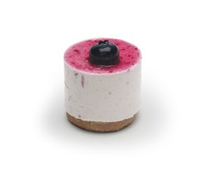 Este mini va dirigido a un perfil más atrevido, el mini cheesecake de arándanos con glaseado sobre una base de galleta dulce des