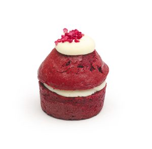 Otro clásico que no se nos puede olvidar es el mini red velvet, este mini es un bizcocho relleno y cubierto con crema de queso, decorado con un crumble de frambuesa.